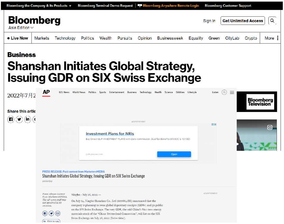 彭博社指出,杉杉股份成功申請發(fā)行GDR并在瑞士證券交易所上市,是中國新能源產(chǎn)業(yè)首批“中瑞通”,對于進一步拓寬海外融資渠道,開拓海外市場,實現(xiàn)全球化戰(zhàn)略,極具創(chuàng)新意義。