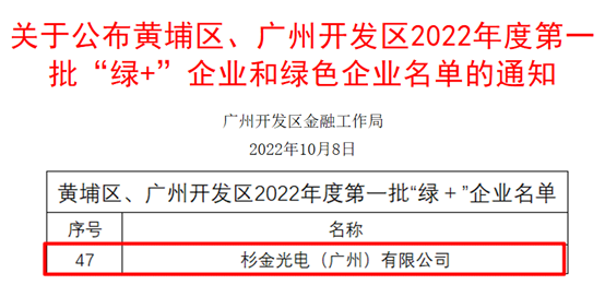 經(jīng)企業(yè)申報,第三方認證機構評審、認定,廣州開發(fā)區(qū)金融工作局受理、審查、公示等程序,杉金廣州成功入選黃埔區(qū)、廣州開發(fā)區(qū)2022年度第一批“綠+”企業(yè)。