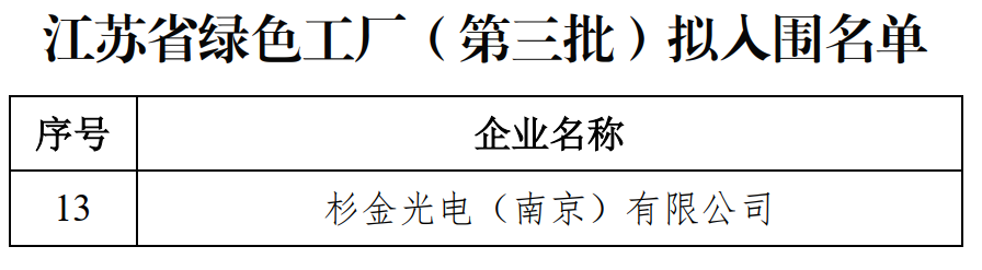 杉金光電(南京)入圍2022年江蘇省綠色工廠(chǎng)
