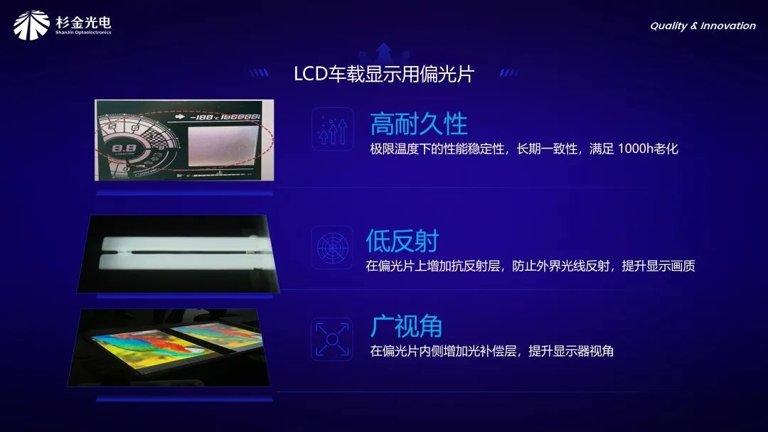 為提升駕駛安全性,車載顯示屏的清晰度規(guī)格日益嚴格,以確保駕駛員可從更廣的視角觀看屏幕,而非僅從正面觀看。這就需要車載顯示用偏光片滿足高對比度和廣視角的要求。針對車載偏光片更高的性能要求,杉金光電開發(fā)了兩大類產(chǎn)品。