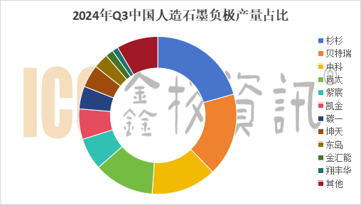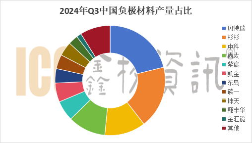 據(jù)ICC鑫欏資訊數(shù)據(jù)顯示,2024年Q3國內(nèi)人造石墨負極材料總產(chǎn)量約49萬噸,上海杉杉占比21%,憑借著領(lǐng)先的技術(shù)優(yōu)勢和市場地位,市占率仍居首位。