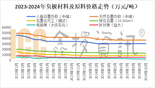 就材料類型來看,國內(nèi)人造石墨負極仍占據(jù)主流地位,人造負極占比不斷提升,2024年Q3占比達約88%,創(chuàng)歷史新高。
