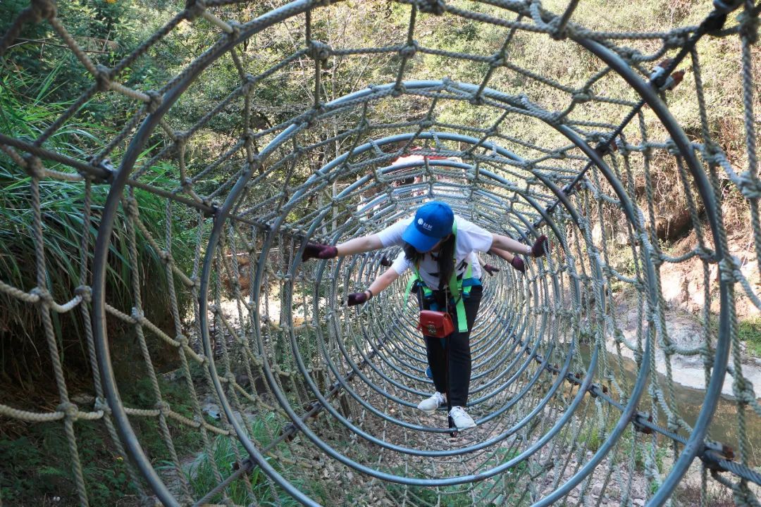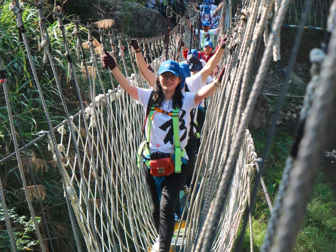 全部懸空的16道橋索僅靠一條安全繩和一雙手套,杉杉股份全員順利抵達終點。